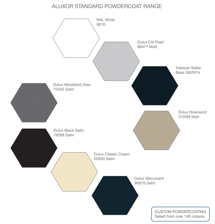 The Stratos III frame and extruded aluminium fascia are available in 8 standard colours. A range of 140 colours is also available to customise both the frame and fascia.